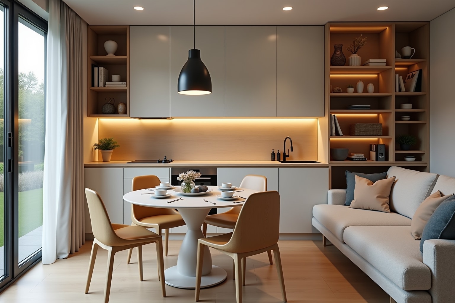 Wähle platzsparende Lösungen wie Klapptische und Barhocker. Nutze die Fensterbank oder die Kücheninsel als Essplatz.