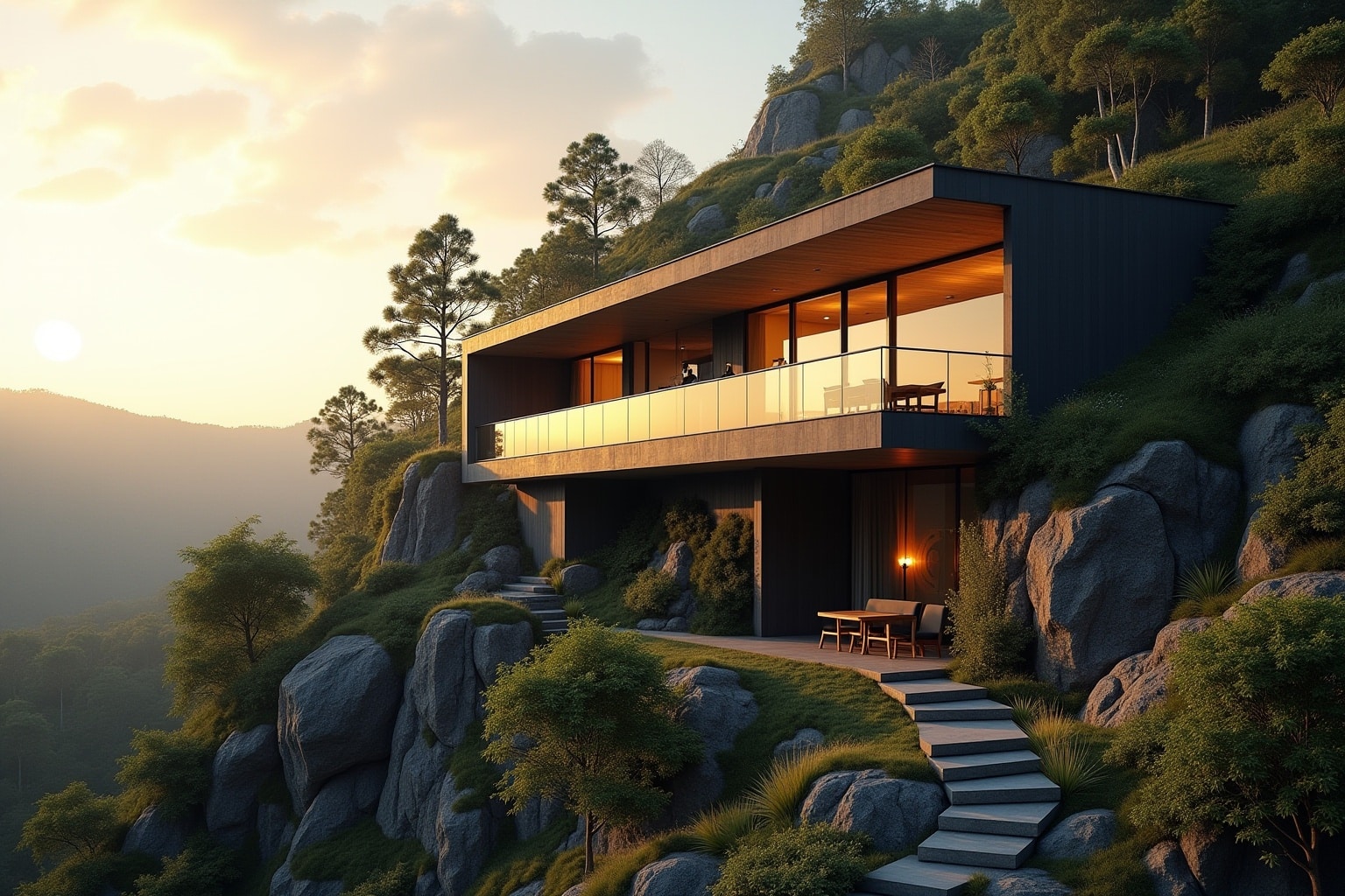 Nutze die Hanglage, um mit freischwebenden Anbauten oder auskragenden Bauteilen spektakuläre Effekte zu erzielen. Wohnbereiche, Balkone oder Terrassen können über den Hang hinaus ragen und dir so eine unvergleichliche Aussicht und das Gefühl von Leichtigkeit vermitteln. Diese Kragträger-Konstruktionen erfordern eine präzise statische Berechnung und robuste Materialien wie Stahlbeton oder Stahl. Sie schaffen einzigartige architektonische Akzente und können den Wohnraum optisch erweitern, indem sie Innen- und Außenbereich fließend miteinander verbinden. Achte darauf, dass die Konstruktion harmonisch in die Gesamtarchitektur integriert wird und die Materialien witterungsbeständig sind.