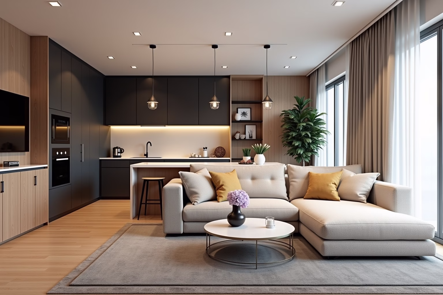 Dekorationselemente wie Pflanzen, Bilder oder Skulpturen können dazu beitragen, den Übergang zwischen Küche und Wohnzimmer fließend zu gestalten. Stelle zum Beispiel eine Pflanze auf die Kücheninsel, die auch im Wohnbereich vorkommt.